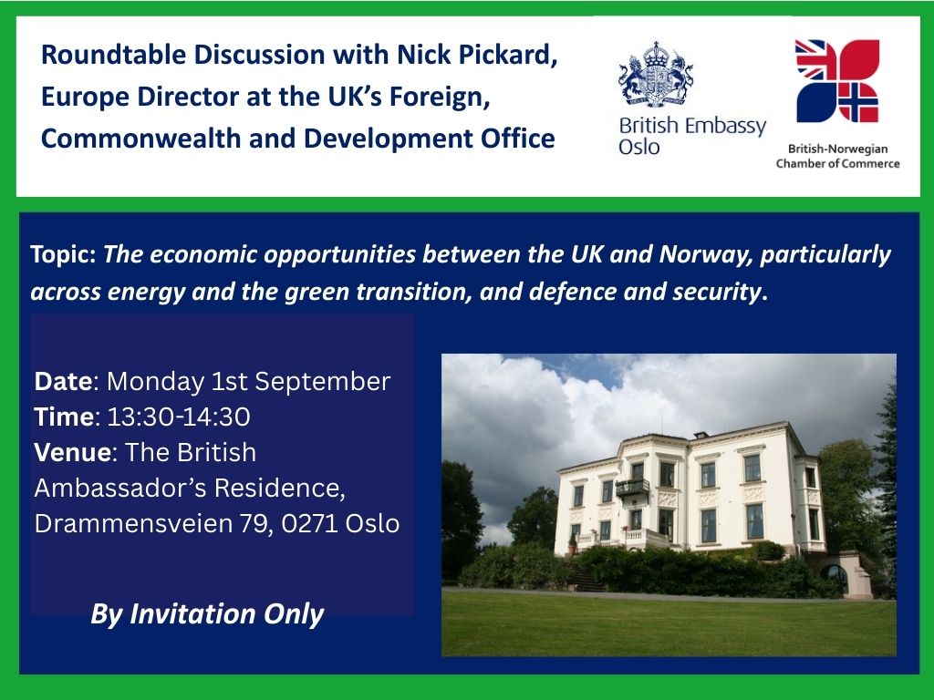 His Majesty’s Ambassador to Norway Jan Thompson and the British-Norwegian Chamber of Commerce will host an industry roundtable discussion to coincide with the visit to Oslo of Nick Pickard, Europe Director at the UK’s Foreign, Commonwealth and Development Office (FCDO), on Monday 1 September at 13:30-14:30 at the British Ambassador’s Residence (Drammensveien 79, 0271 Oslo).